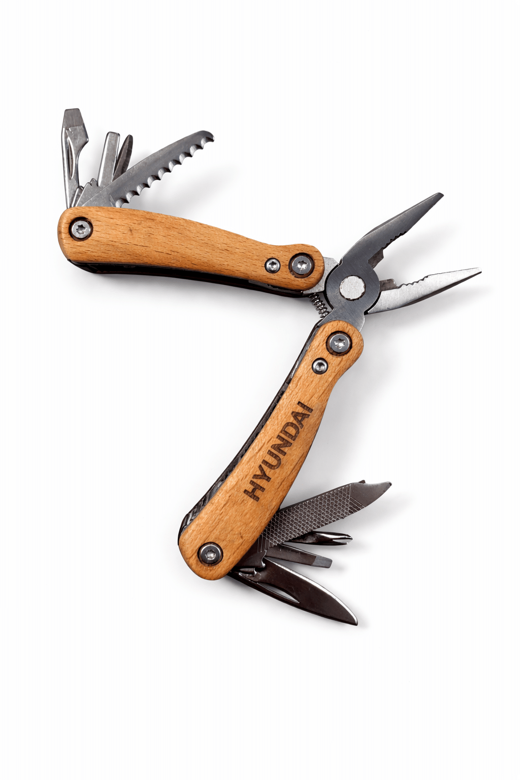 Presentamos nuestra herramienta múltiple compacta, fuerte y duradera, fabricada en acero inoxidable de alta calidad con mangos de madera de haya. Esta herramienta esencial es imprescindible para cada explorador, manitas y amante de las actividades al aire libre. Cuenta con 12 funciones: un alicate de gran boca, alicates estándar, un cortador de alambre, un cuchillo dentado, un abrebotellas/abre latas, un destornillador plano, un destornillador plano mediano, un cuchillo pequeño, un destornillador Phillips, un cuchillo mediano, una lima y un limpiador de lima. La madera de haya utilizada proviene de prácticas sostenibles, ecológicas y socialmente responsables.